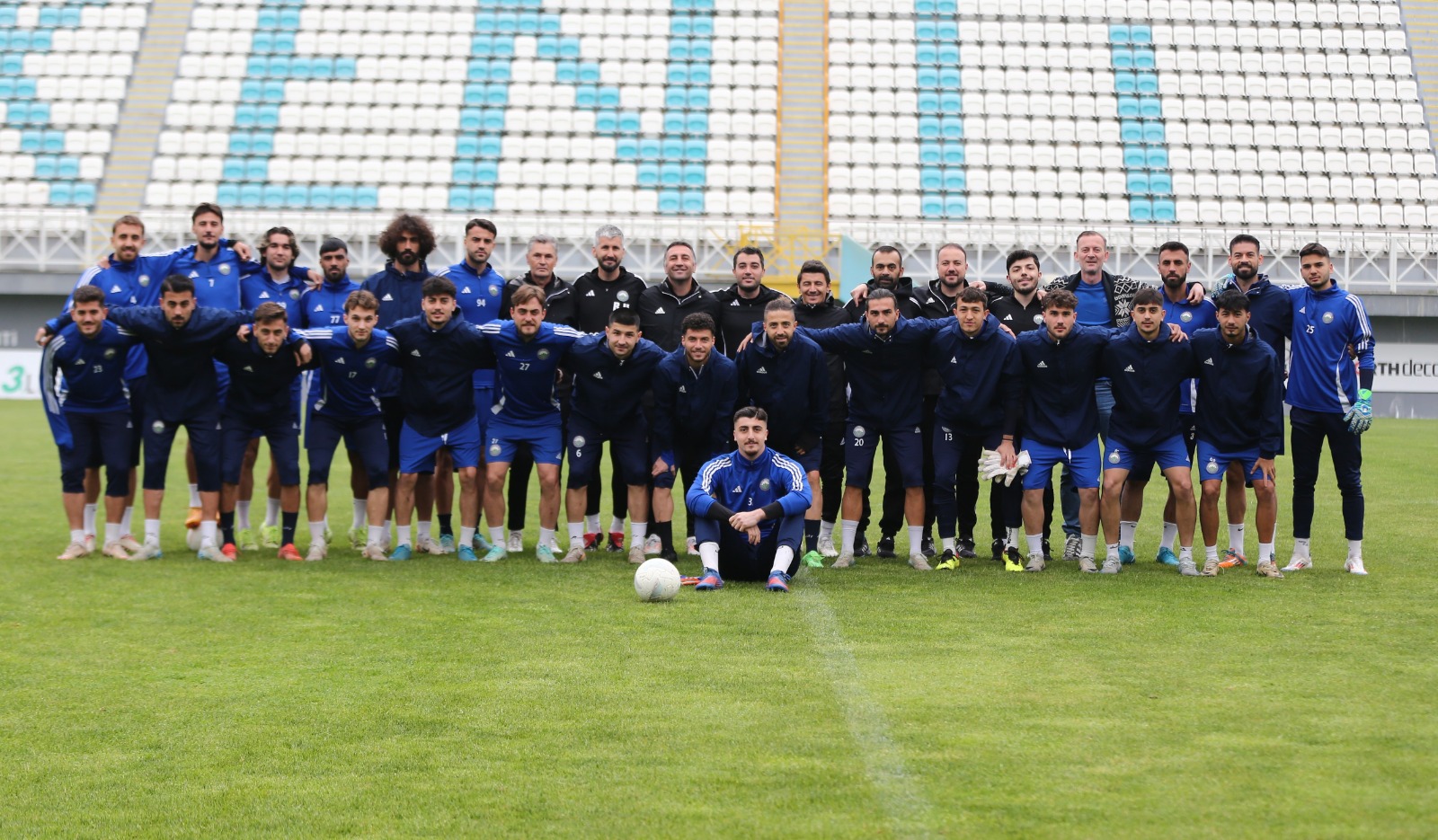 Sezonun son antrenmanı öncesinde mavi beyazlı futbolcular, teknik ekip, masör ve malzemeciler sezonu ölümsüzleştirmek için anı fotoğrafı pozu verdiler.
